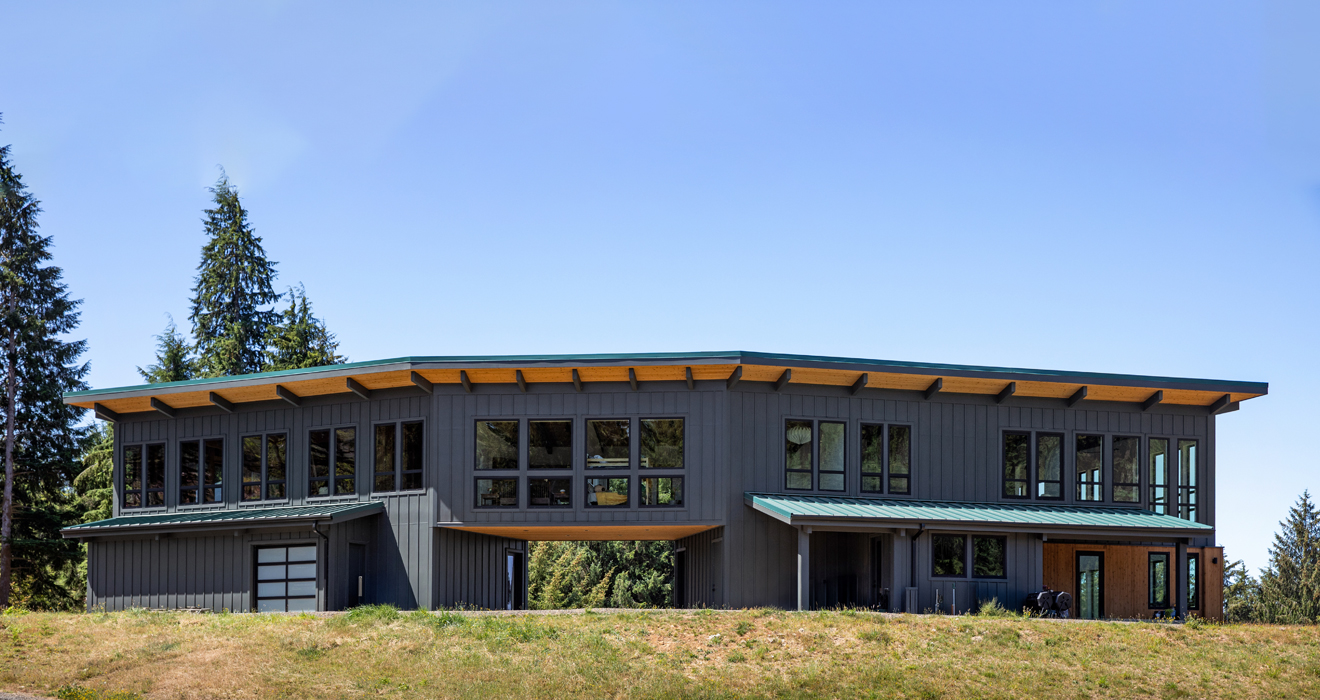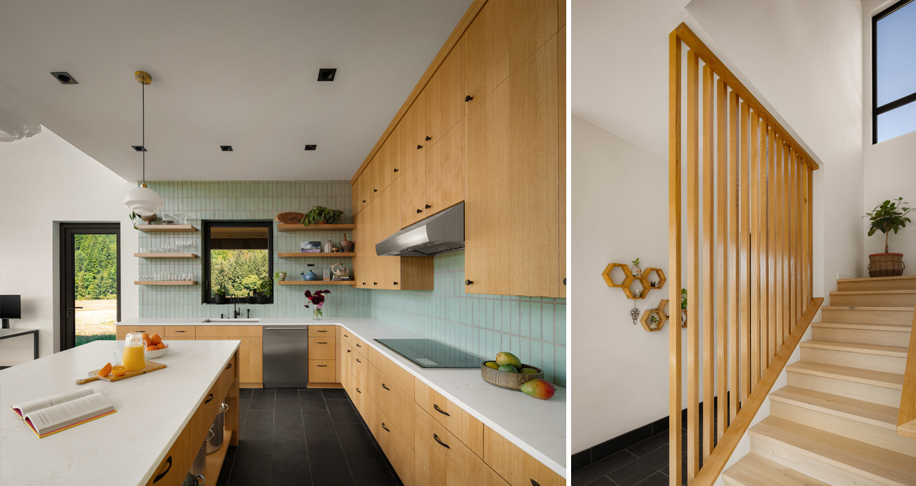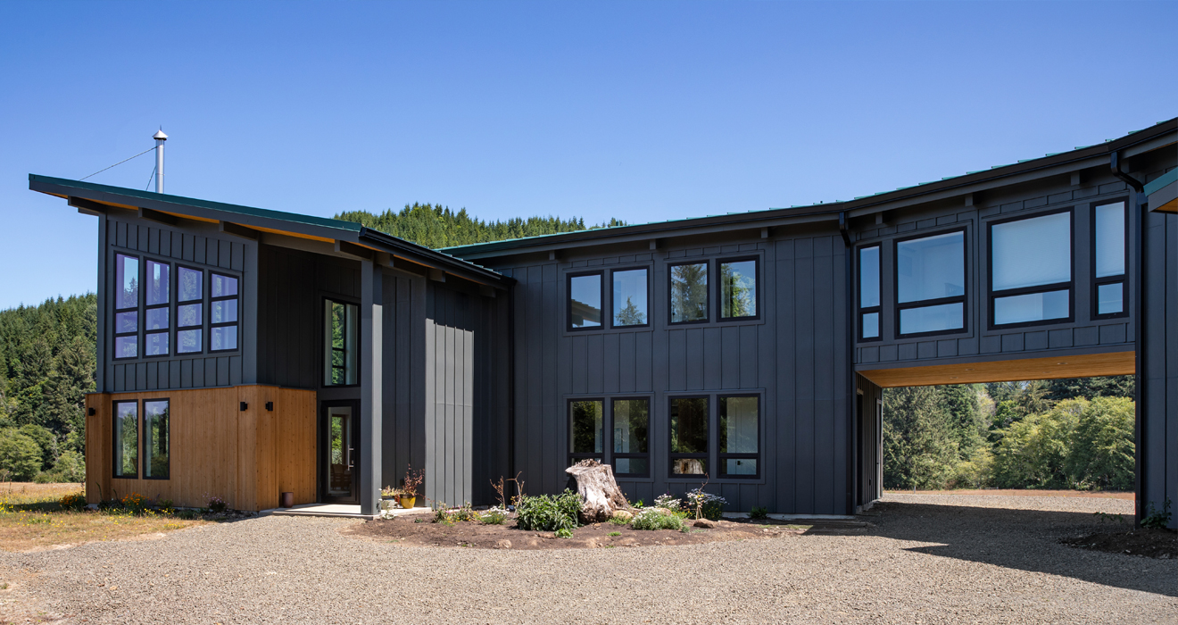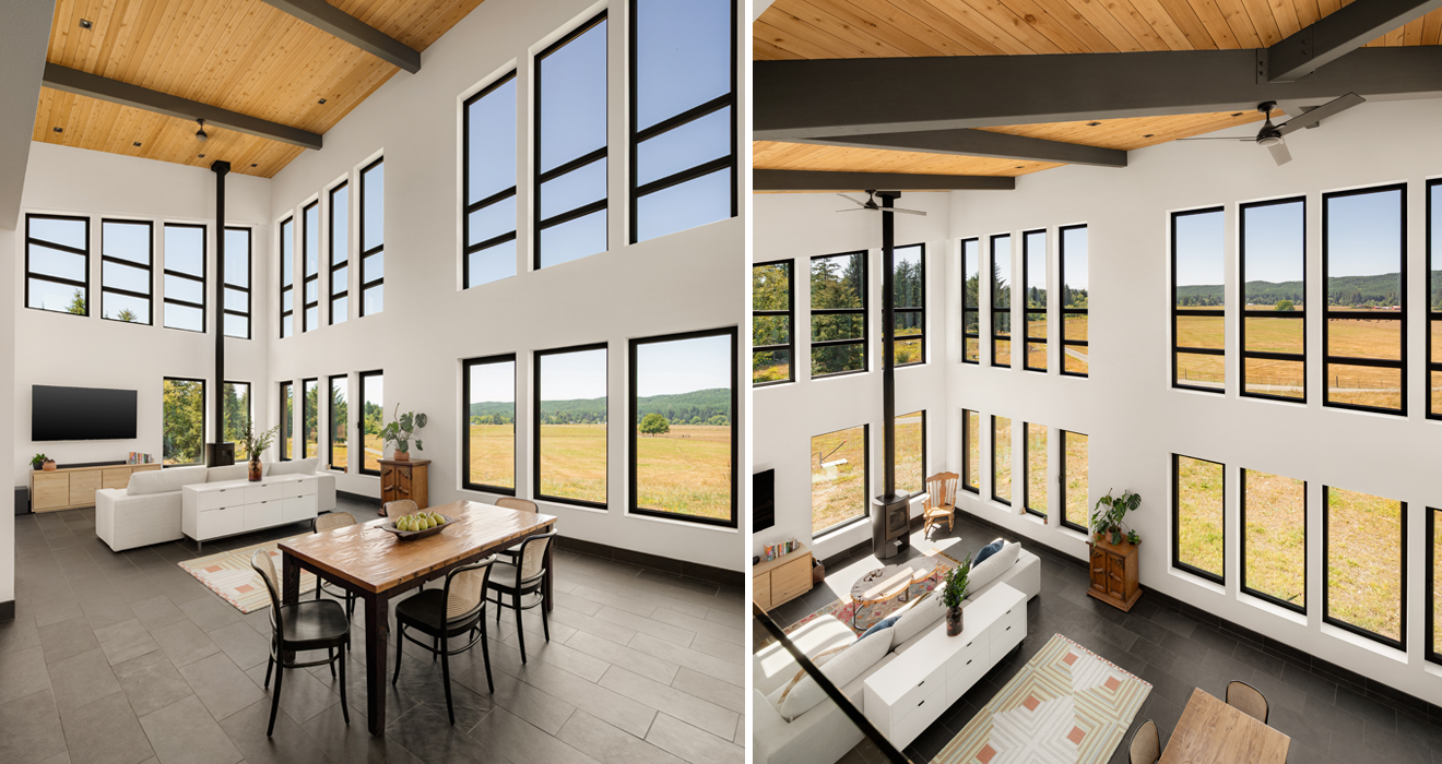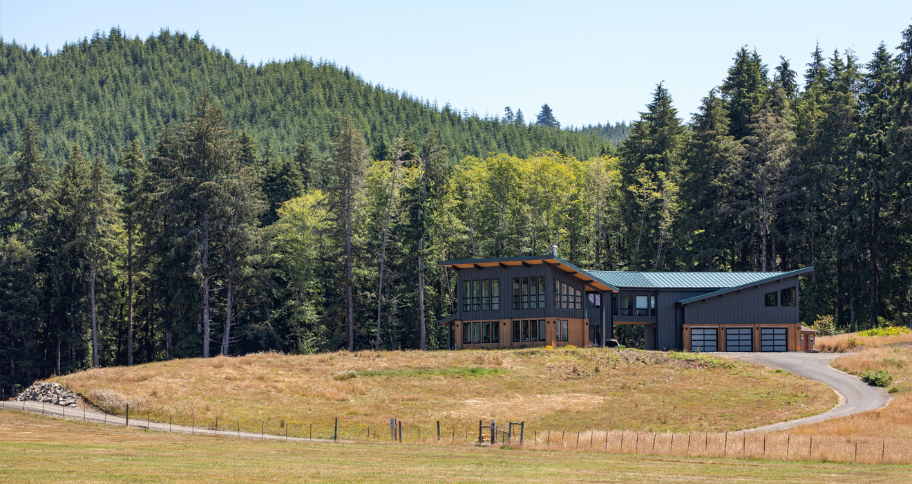 The house atop the hill at Euchre Creek Farm looks out over verdant, grassy farmland in an arc.  The family living here tends the land and stands sentinel over it. The house here curves along the shape of the crest to give them endless windows looking out over their charge.  It is long and thin, harvesting a cross breeze and warming the rooms with sunlight.  Its mid-century modern style leans on canted angles, vaulted wood ceilings, and exposed beams to create spaces for unwinding after a day on the farm.